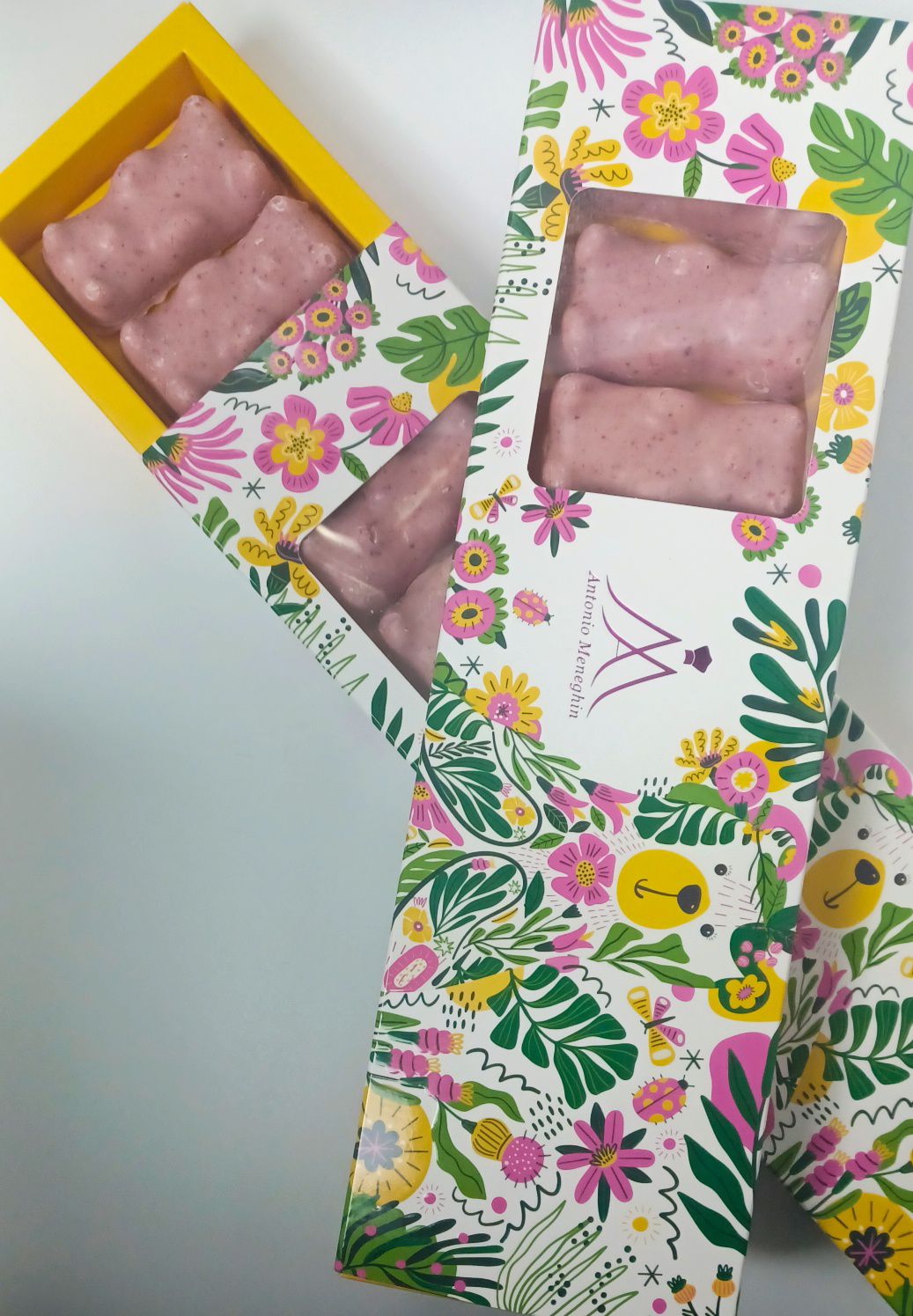 Boîte de 8 oursons enrobés de chocolat blanc framboise bio