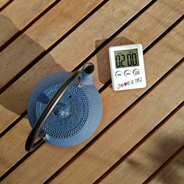 Il est tout simple, tout mignon avec le logo J’adore le thé ! avec un écran très lisible tout en restant compact (7 x 5.3 cm). Avec l’aimant au dos vous pouvez le fixer sur le frigo. Il fonctionne avec une pile LR1130 (= LR54, AG10, 389, SR1130…)