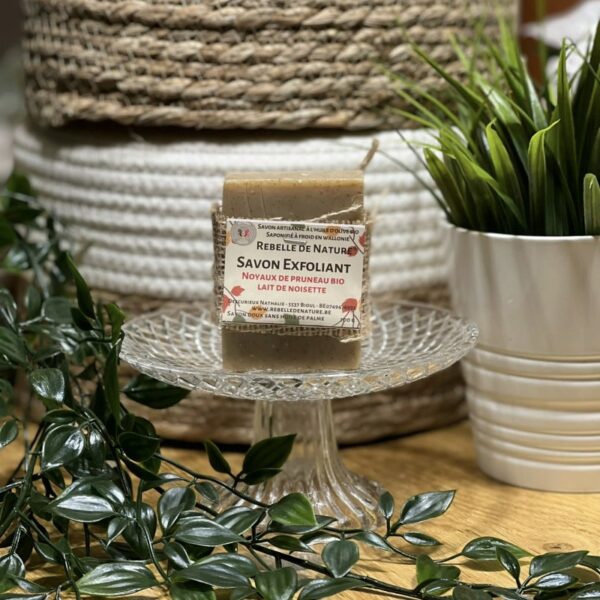Ingrédients : Huile d’olive*, huile de coco*, huile de ricin* et de tournesol*, beurre de karité*, cire d’abeille, huile d’amandon de pruneau de Gascogne*, lait de noisette, argile blanche, noyaux de pruneau en poudre, huiles essentielles.