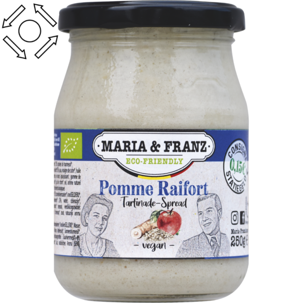 Ingrédients : Huile de colza*, pommes* 22%, graines de tournesol*, CÉLERI rave*, eau, raifort* 4% (racine de raifort* 53%, eau, vinaigre de cidre*, huile de tournesol*, jus de pomme concentré*, sel marin, épaississant : gomme guar*), sirop d’agave*, vinaigre de cidre*, jus de citron*, sel, arôme naturel (MOUTARDE), arôme naturel (poivre). * Agriculture biologique