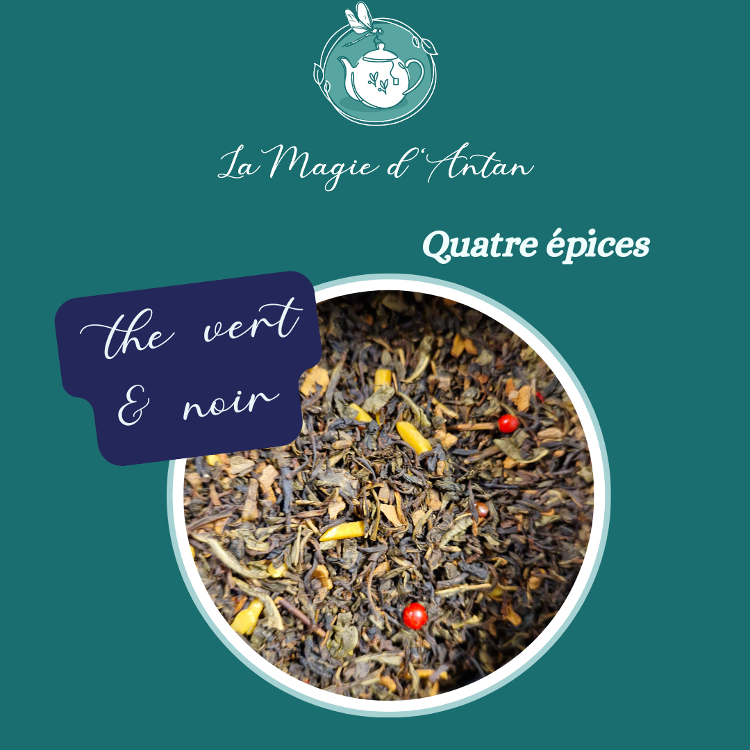 Thé vert, thé noir, morceaux de cannelle, amandes effilées, arôme, poivre rose, clous de girofle, macis.
